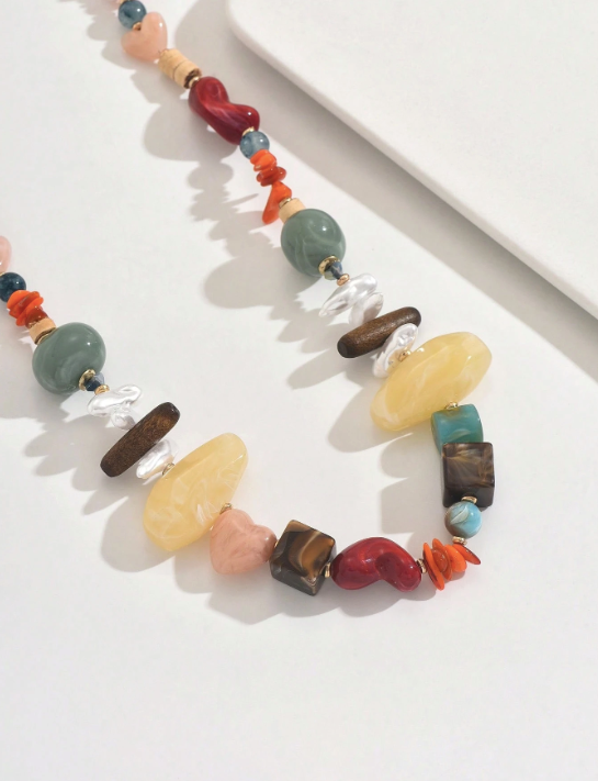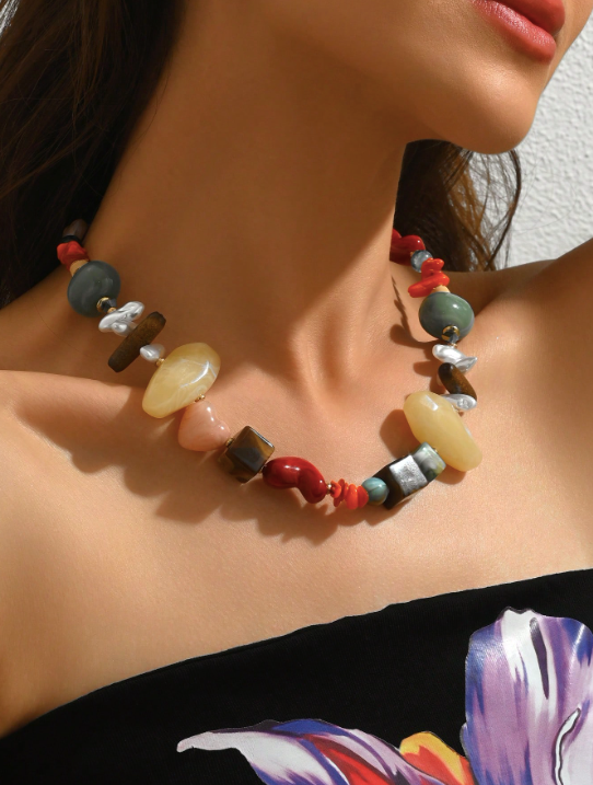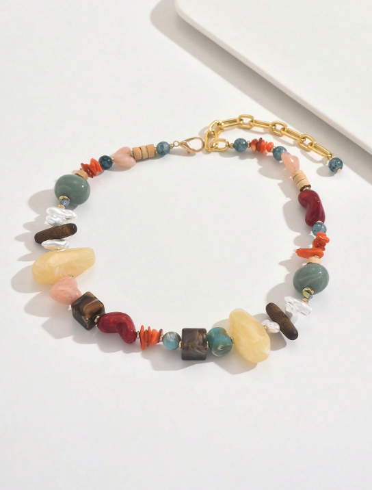 Collar liviano y elegante, con piedras de distintos colores y tamaños.